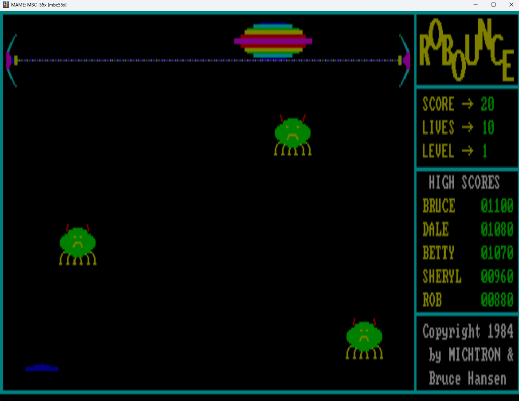 ROBOUNCE is another Michtron game. similar to space invaders. file type is a hbe file which seems to be from a disk imager drive. Worked fine in mame emulator. Also ‘Attack’ is included in this image which is a text base shooter similar to cosmic avenger.